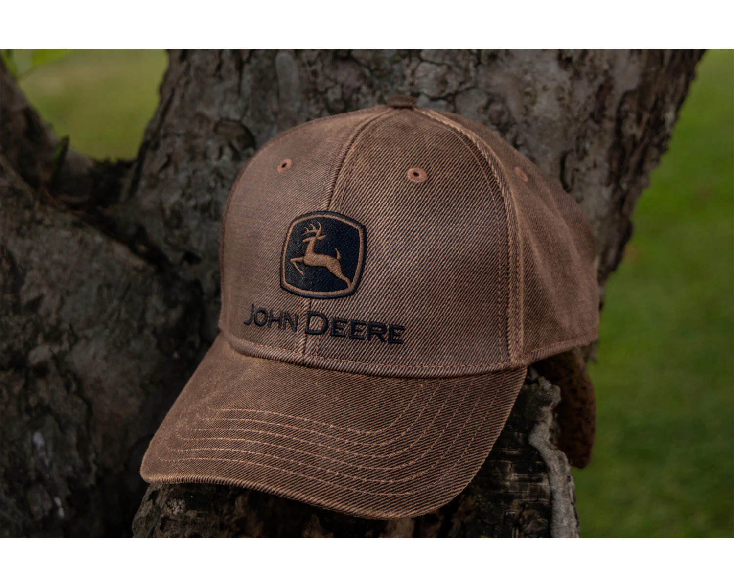 John Deere oilskin style cap featuring an embroidered logo and an adjustable hook/loop Velcro closure.