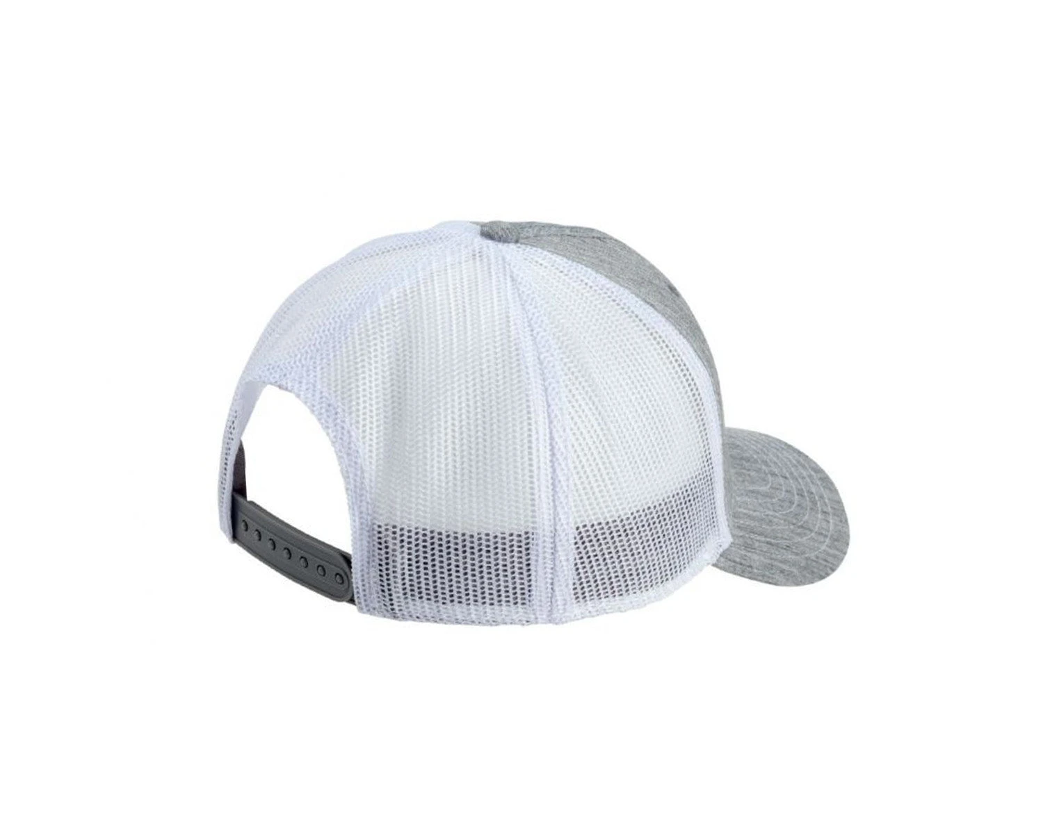 John Deere grey and white cap with leather logo patch. Featuring an adjustable snap back closure.