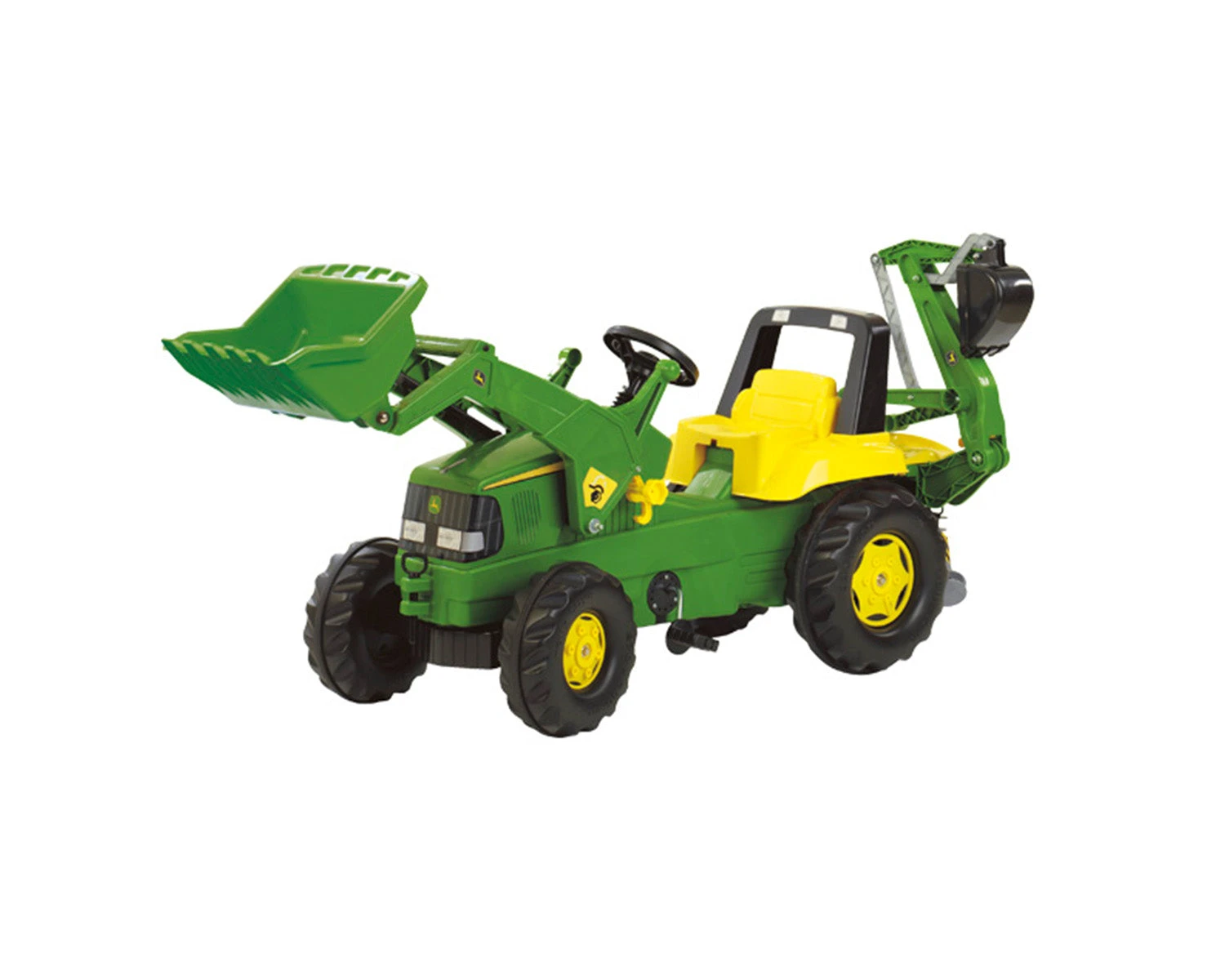 The John Deere rollyJunior pedal Tractor features an opening bonnet, a loader and an excavator. The seat is also adjustable.