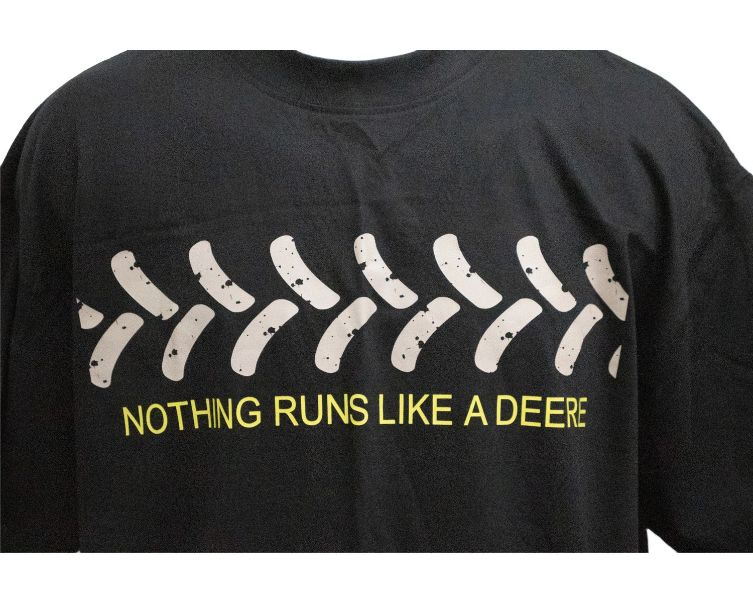 John Deere t-shirt featuring a tyre tracks graphic across the chest – nothing runs like a Deere.