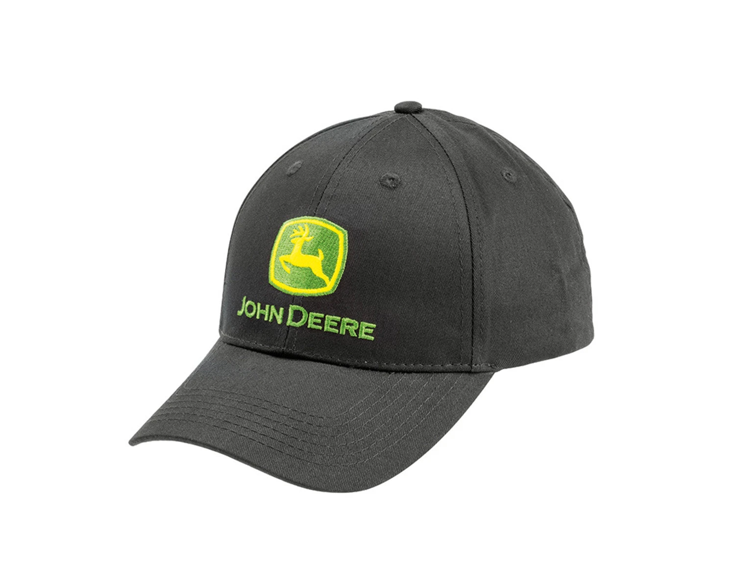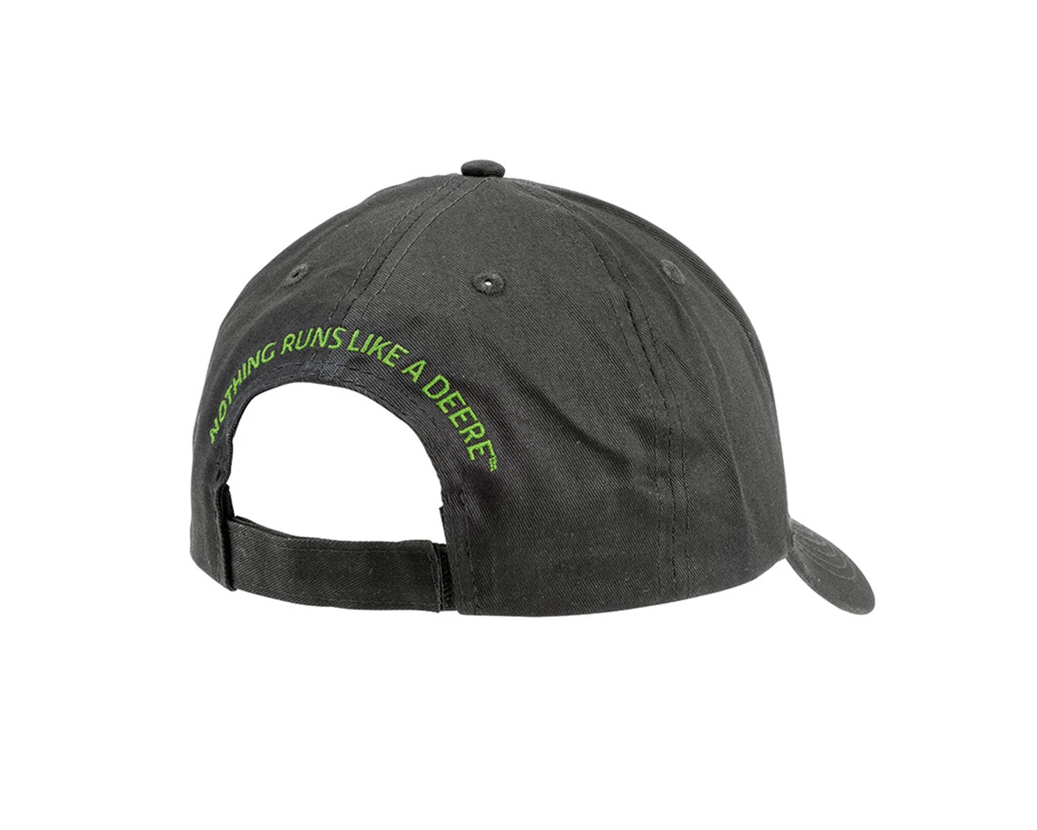 John Deere black cap featuring the traditional embroidered logo and an adjustable snap back closure.