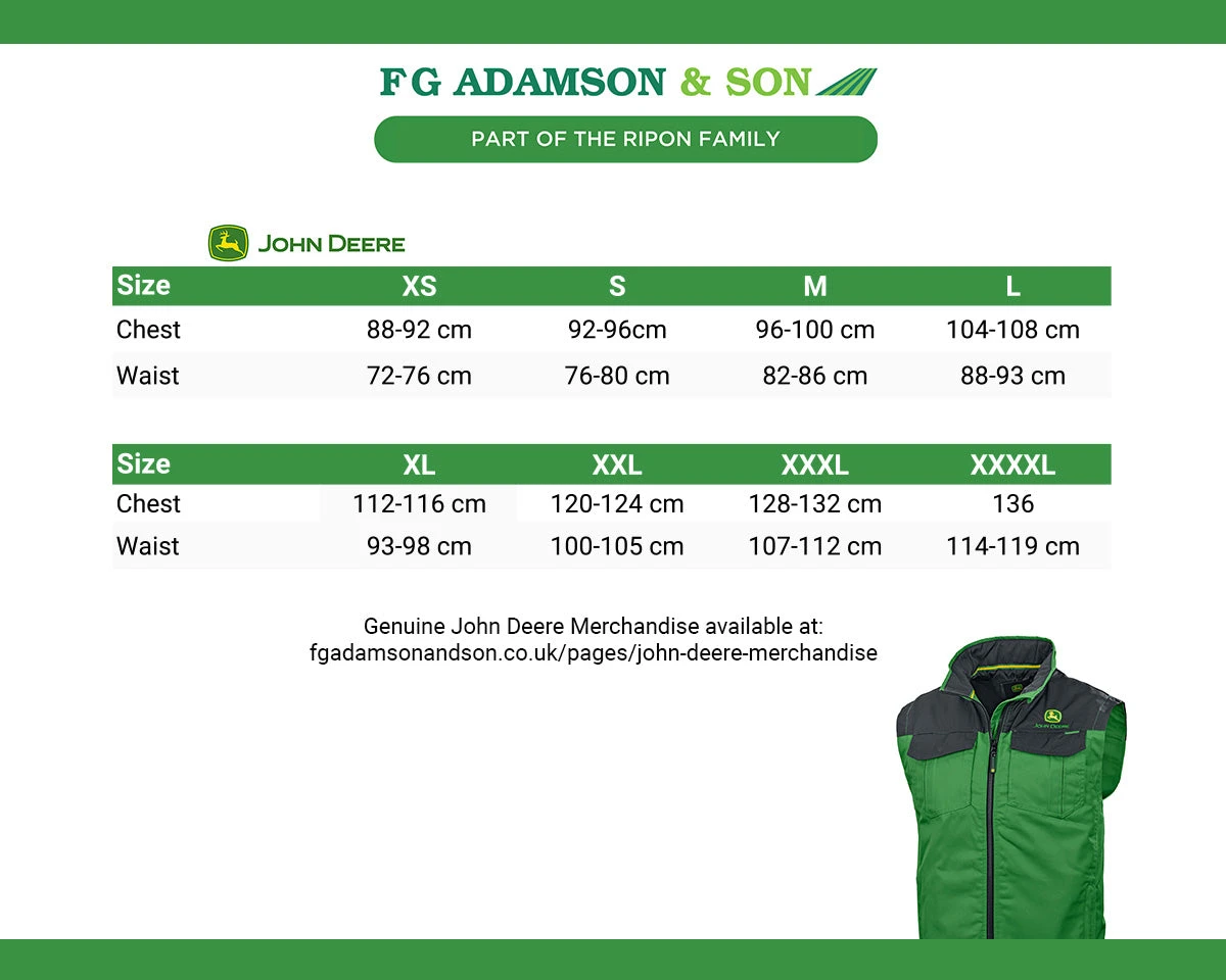 This comfortable, insulated body warmer features the iconic John Deere branding and multiple pockets as well as an adjustable waist. 245 g/m2