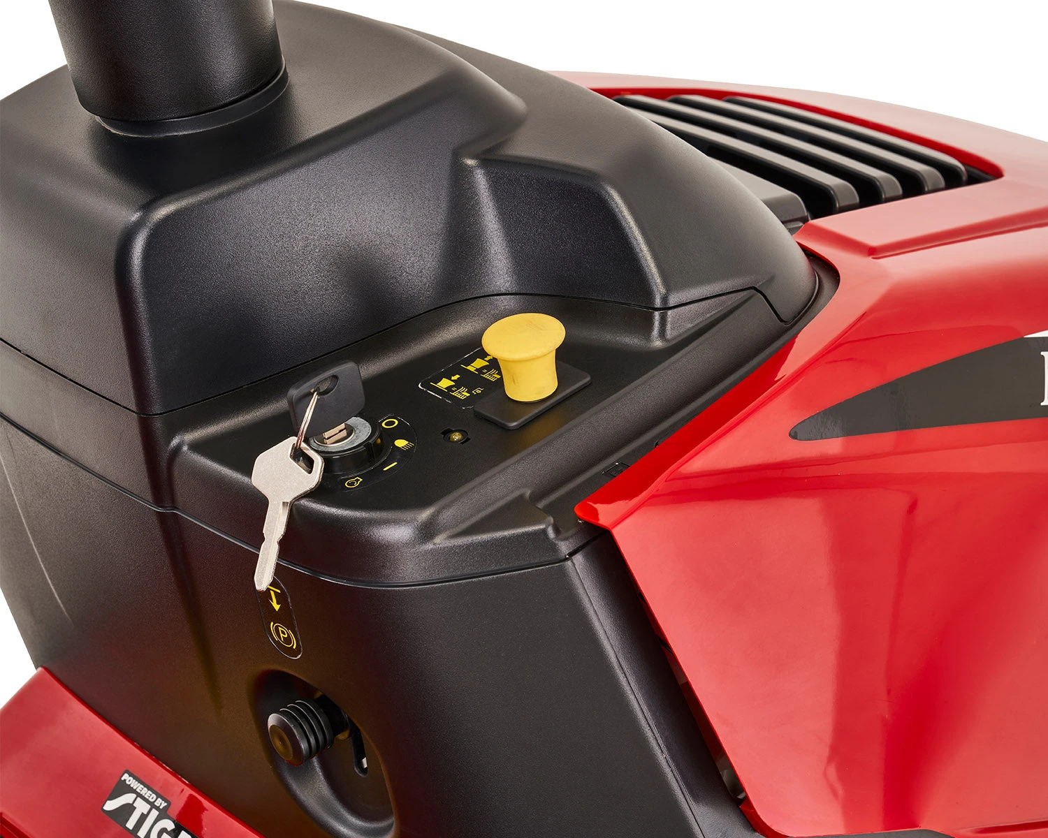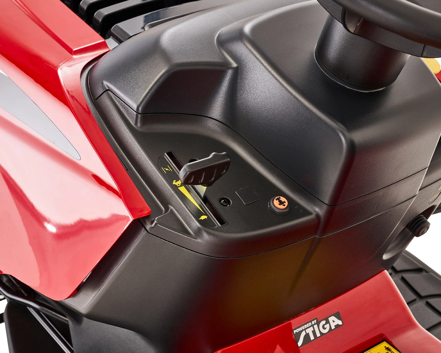 This model features a foot operated hydrostatic drive to give you maximum control over the mower’s speed and direction. The harder you press the drive pedal forward, the faster the tractor drives forward. The harder you press the pedal backwards, the faster the tractor reverses. This simple control makes the transition from mowing wide open spaces to mowing tight areas very easy.