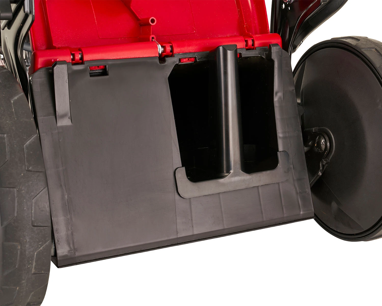 The cutter deck is made from steel for durability and the height of cut is adjusted by a single lever giving a range of six positions. Grass collection and mulching both come as standard as do large diameter rear wheels to make the mower easier to use on rougher areas of grass.