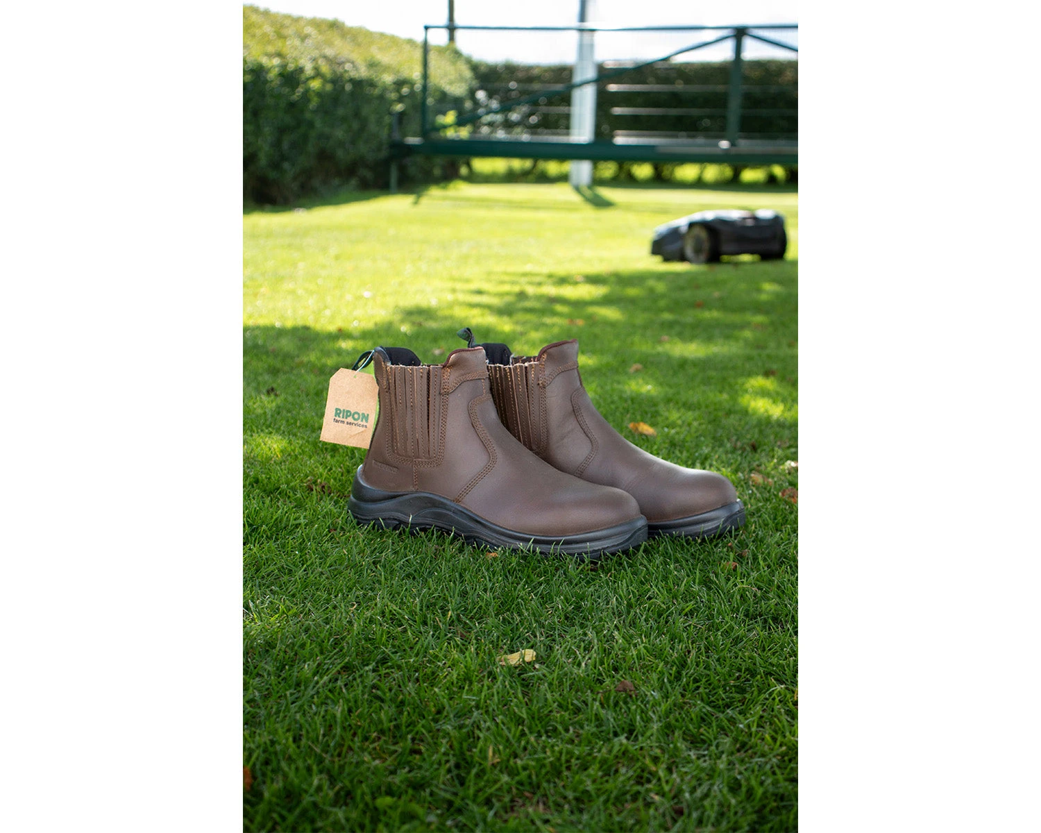 The Ripon Farm Services Safety boots are in a comfortable pull on style and feature a waterproof leather upper to keep your feet dry. This style also has steel toe caps for added protection.